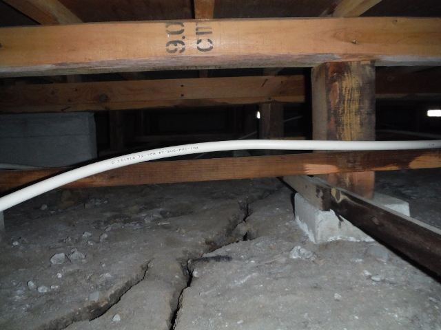床下の地盤に不同沈下よる亀裂が見られ、基礎にまで亀裂が入り建物にも傾きが現れています。