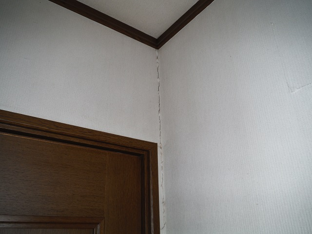 地震による揺れや木材の伸縮などが原因と考えられます。特にドアなどの開口部のかどや室内の入隅部、下地ボードのジョイント部に発生しやすい事例です。