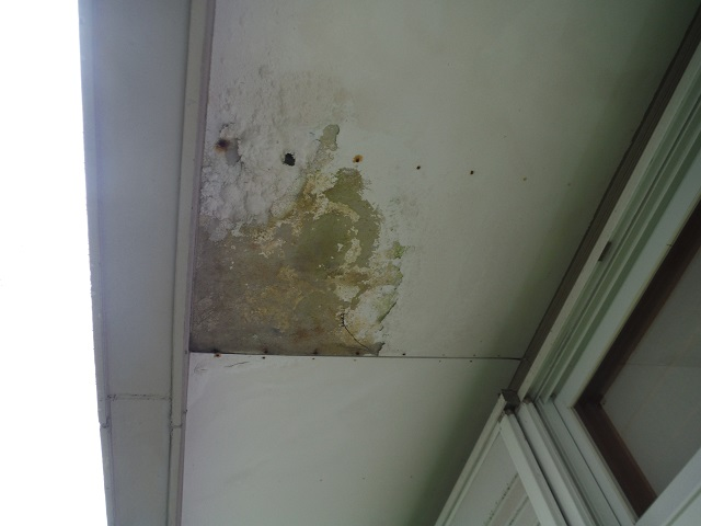 広縁の天井に雨シミ跡があります。建物が傷んでしまうため早めの対応が必要です。原因は上記のようなバルコニーの防水層の劣化によると考えられます。